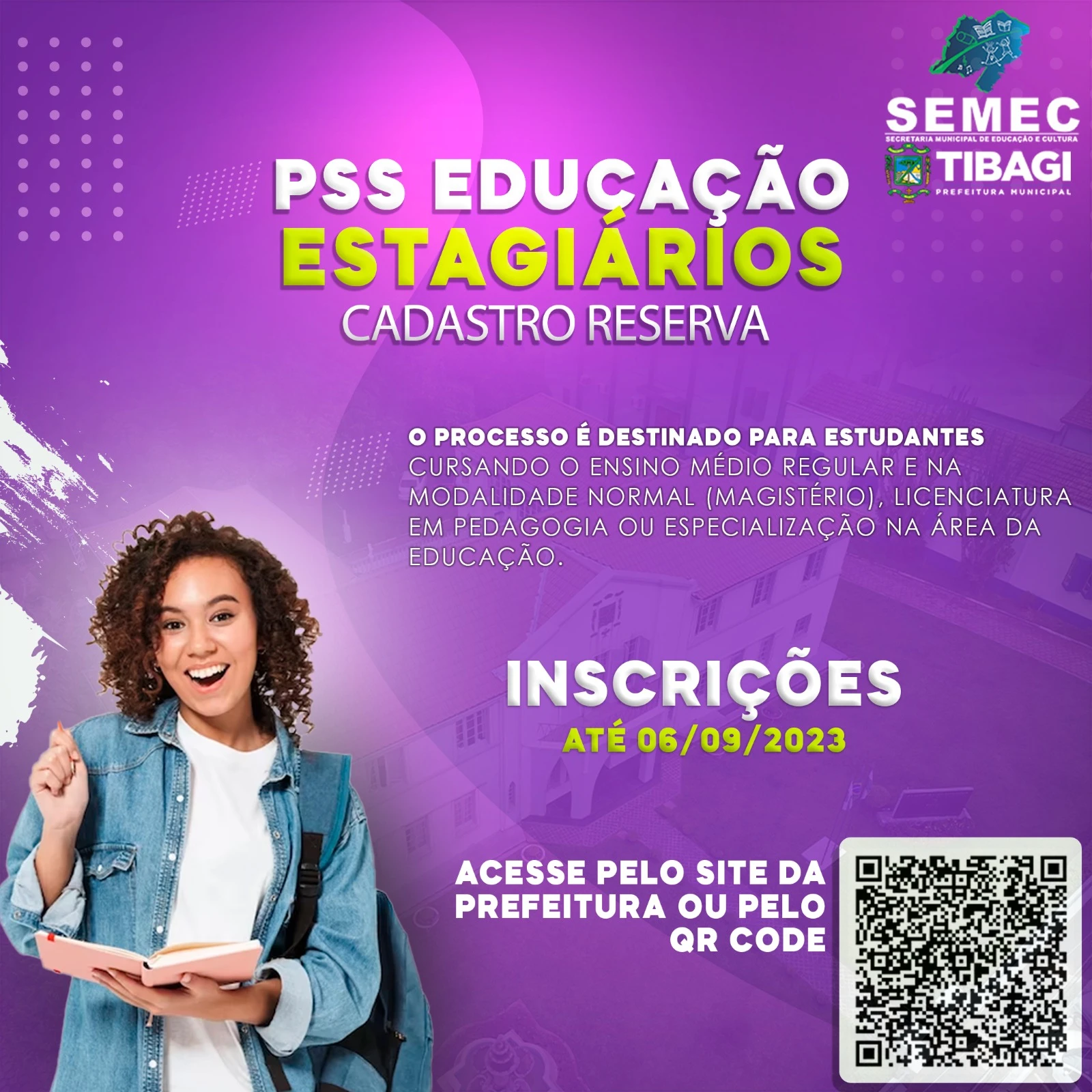 As inscrições podem ser feitas no site da Prefeitura de Tibagi no banner do PSS dos estagiários até o dia 06 de setembro exclusivamente pela internet.