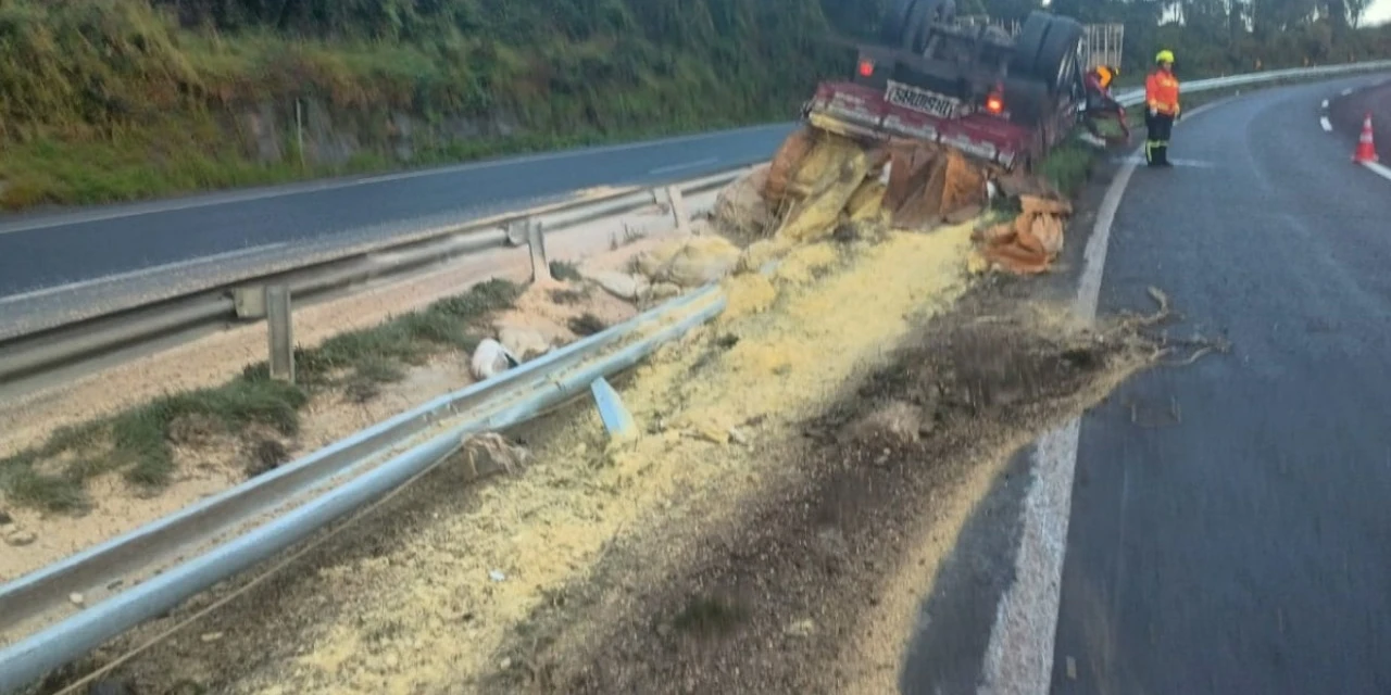 Ainda de acordo com a PRF, parte da carga de farelos para ração que estava no caminhão caiu sobre a pista. Apesar disso, não houve a necessidade de interromper o tráfego na rodovia. Equipes trabalha na limpeza da pista e na remoção do veículo.