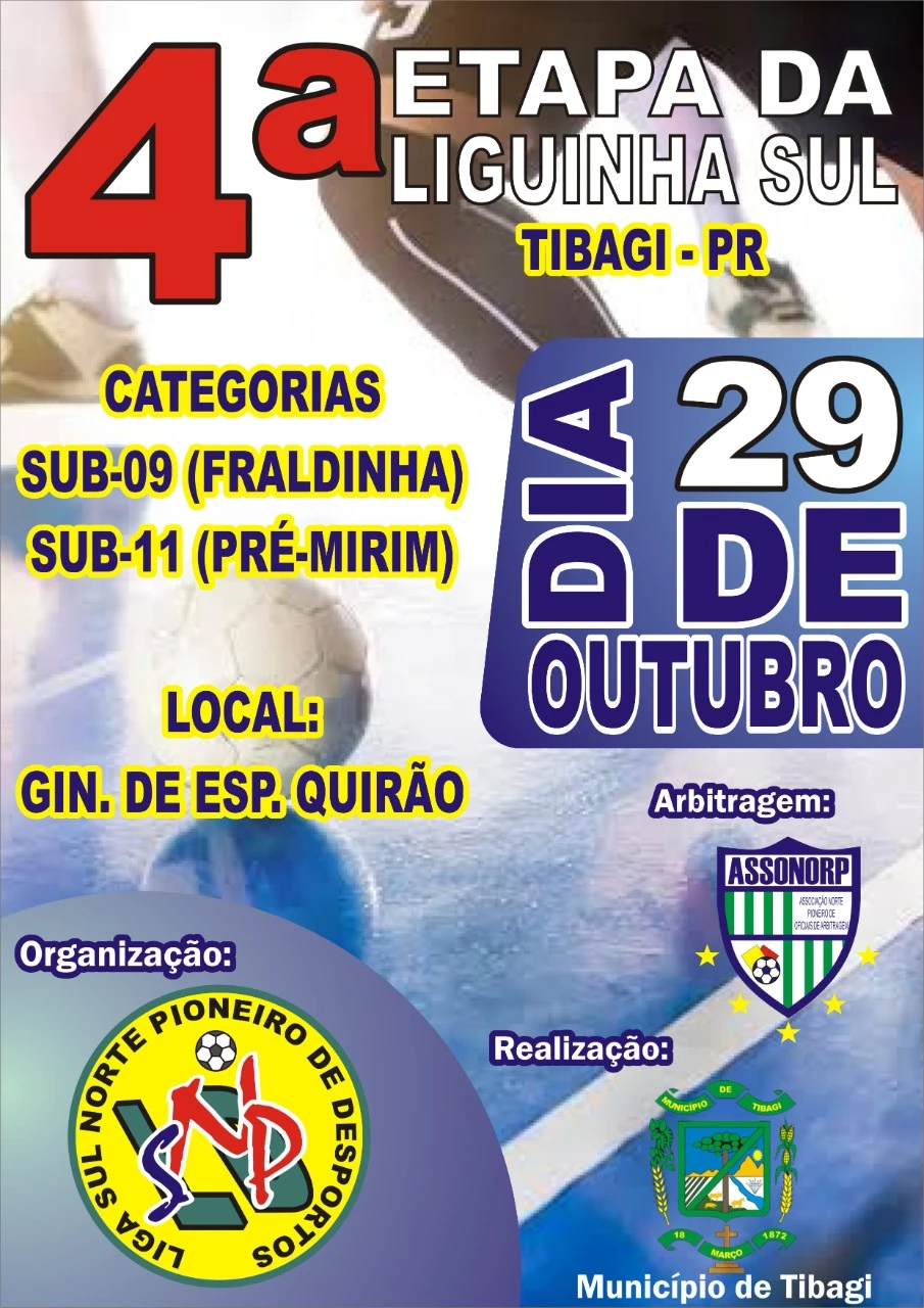 Durante o dia será disputada a 4ª etapa da Liguinha Sul de Futsal nas categorias sub-09 (fraldinha) e sub-11 (pré-mirim). A competição é organizada pela Liga Sul Norte Pioneiro de Desportos com o apoio da Prefeitura de Tibagi.