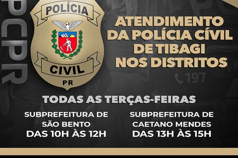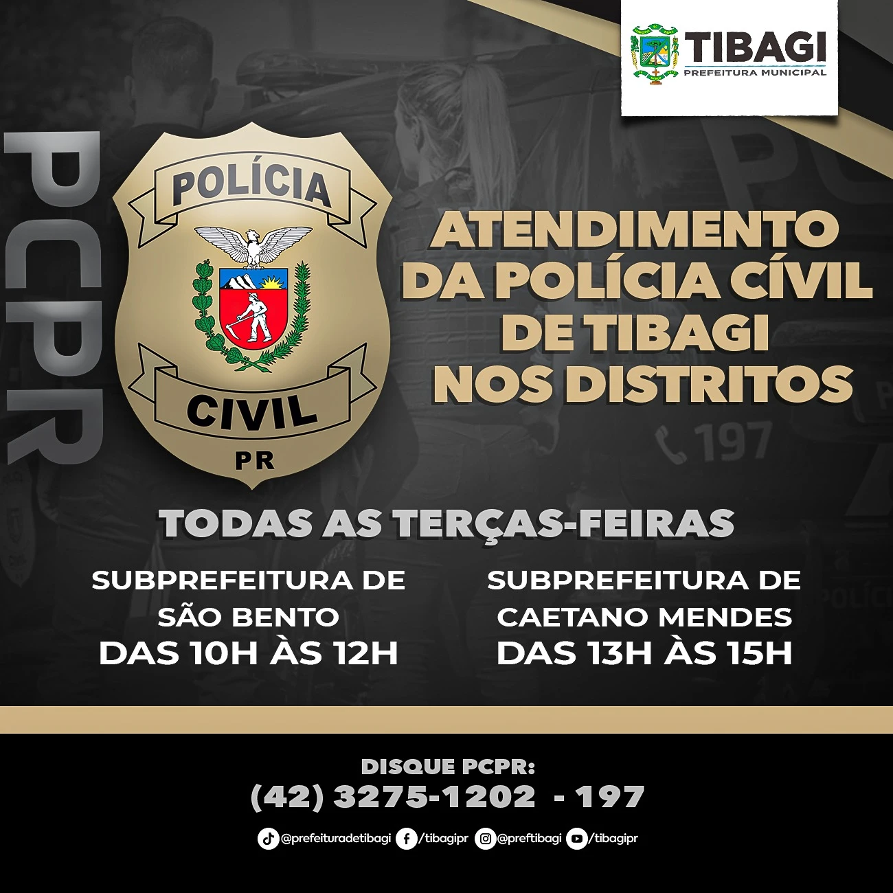 COM ASSESSORIAS - A Prefeitura de Tibagi informa que a equipe da Polícia Civil do município realizada atendimento da população tibagiana todas as terças-feiras nos Distritos de Alto do Amparo/São Bento e Caetano Mendes.