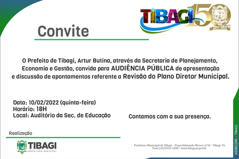 COM ASSESSORIAS - A Prefeitura Municipal de Tibagi, através da Secretaria de Planejamento, Economia e Gestão, informa que a segunda audiência pública de apresentação e discussão de apontamentos referentes a revisão do Plano Diretor Municipal foi adiado para o dia 10 de fevereiro, próxima quinta-feira.