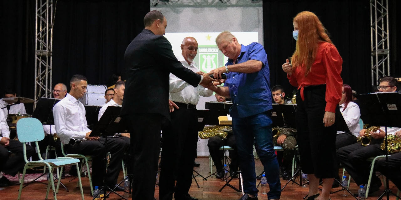 A entrega simbólica dos novos instrumentos foi realizada pelo prefeito Artur Butina e pela secretária da SEMEC Anne Elize Wrobel durante a apresentação da banda municipal no último sábado (19). O evento foi realizado para comemorar os 122 anos da banda, fundada em 1899, e também para comemorar o dia do músico, que é lembrado nesta segunda-feira (22).
