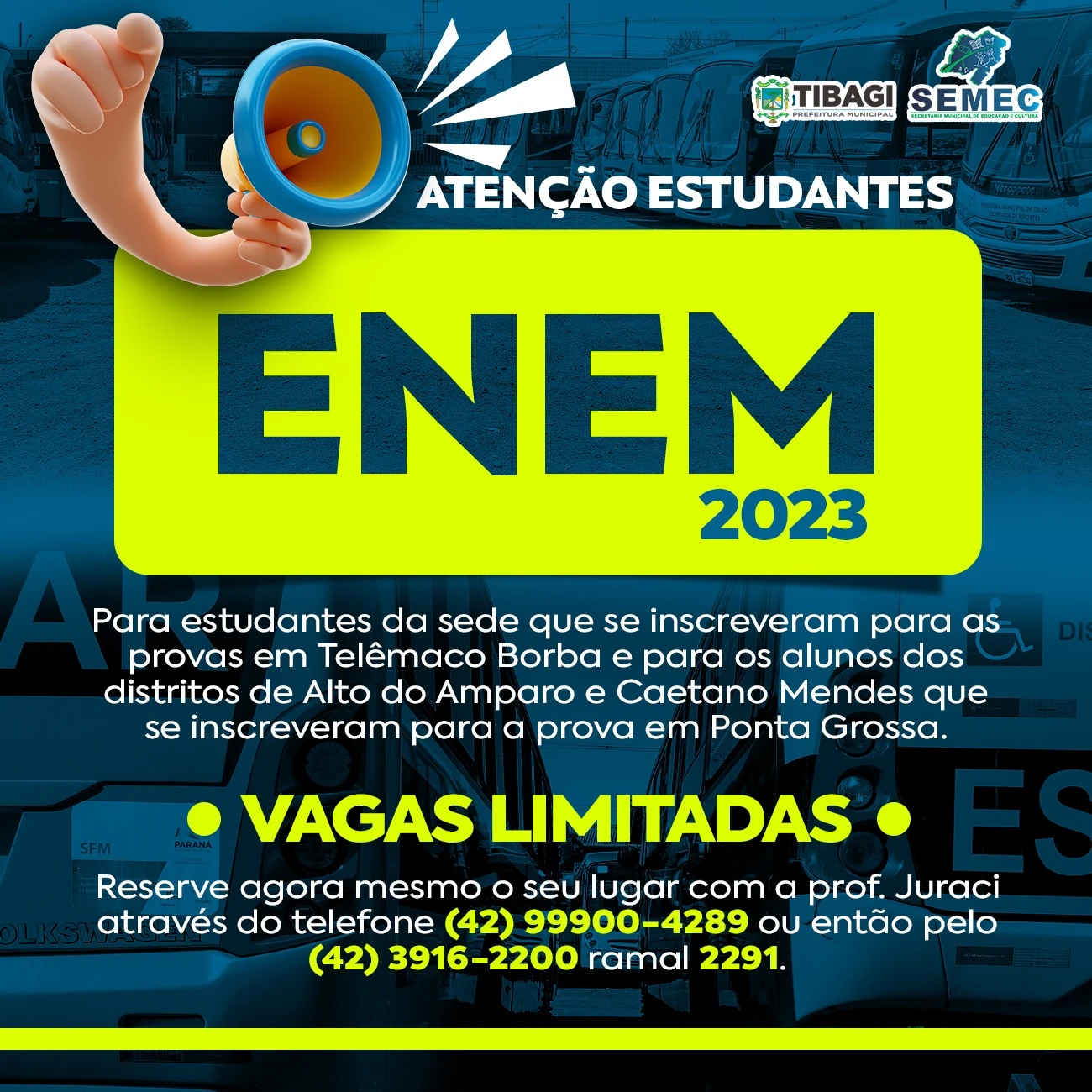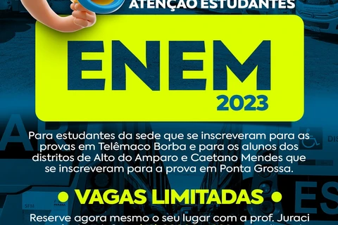 COM ASSESSORIAS - A Prefeitura de Tibagi, através da Secretaria de Educação e Cultura (SEMEC), informa que mais uma vez irá fornecer transporte gratuito para estudantes que se inscreveram para realizar o Exame Nacional do Ensino Médio (ENEM) 2023.