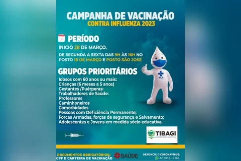 COM ASSESSORIAS - A Prefeitura de Tibagi, através da Secretaria de Saúde, inicia nesta quarta-feira (29) a campanha nacional de vacinação contra a gripe. Neste ano, conforme orientação do Ministério da Saúde, a campanha não será dividida por fases.
