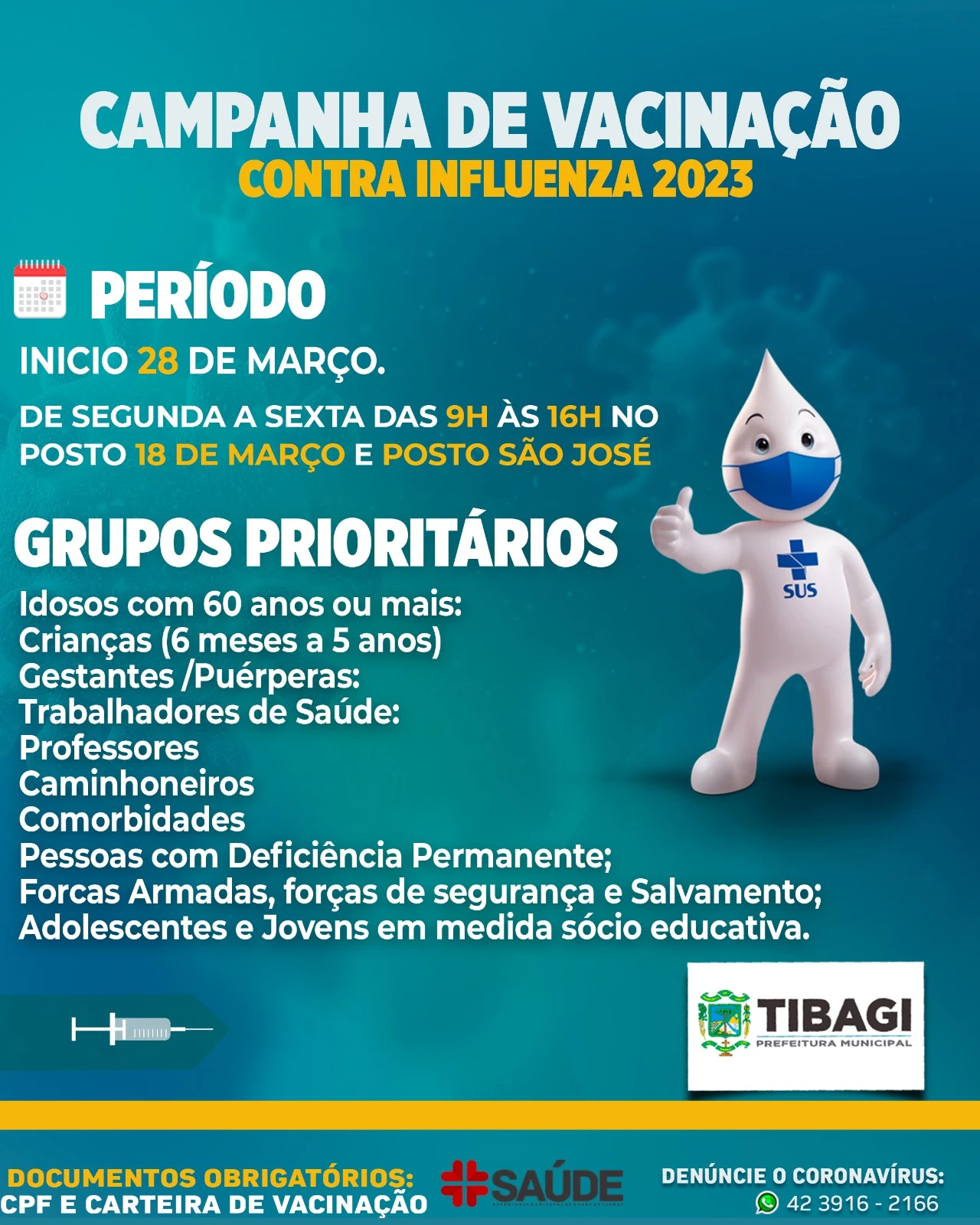 Em Tibagi, a vacina será aplicada nas UBS 18 de Março e São Jose (na sede) e nas UBS Alto do Amparo, São Bento e Caetano Mendes (distritos) das 09h às 16h.