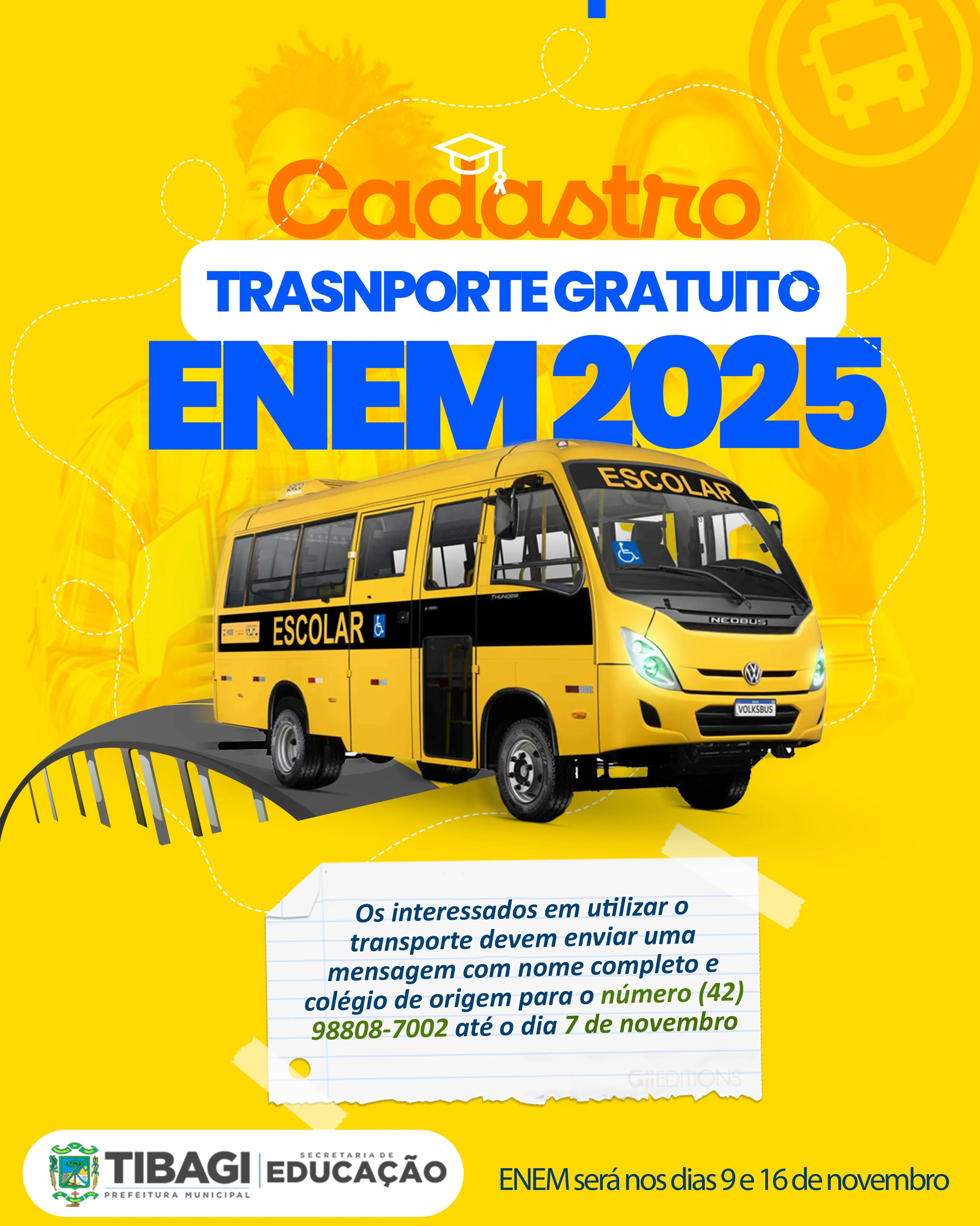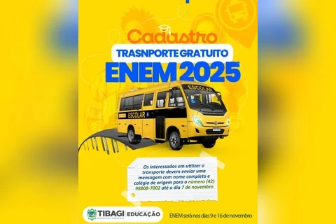 COM ASSESSORIAS - A Prefeitura de Tibagi, por meio da Secretaria Municipal de Educação, vai disponibilizar transporte gratuito para os estudantes que farão o Exame Nacional do Ensino Médio (ENEM) nos dias 9 e 16 de novembro. A iniciativa busca garantir que todos os participantes tenham acesso aos locais de prova com segurança e pontualidade.