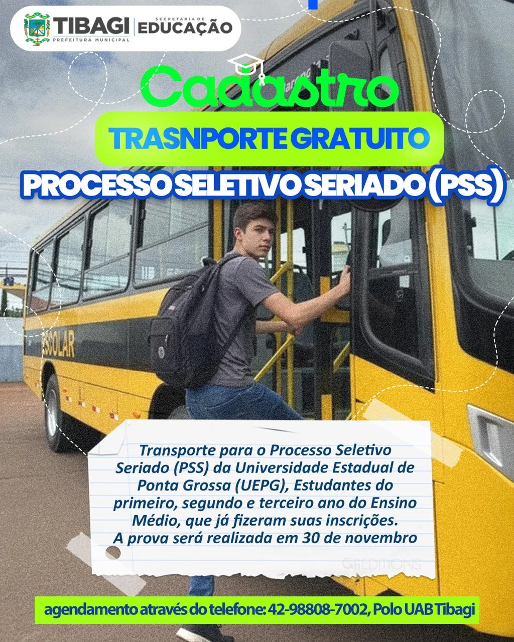 COM ASSESSORIAS - A Prefeitura de Tibagi, por meio da Secretaria Municipal de Educação, vai disponibilizar transporte gratuito para os estudantes que participarão do Processo Seletivo Seriado (PSS) da Universidade Estadual de Ponta Grossa (UEPG), voltado a alunos do 1º, 2º e 3º ano do Ensino Médio que já realizaram suas inscrições.