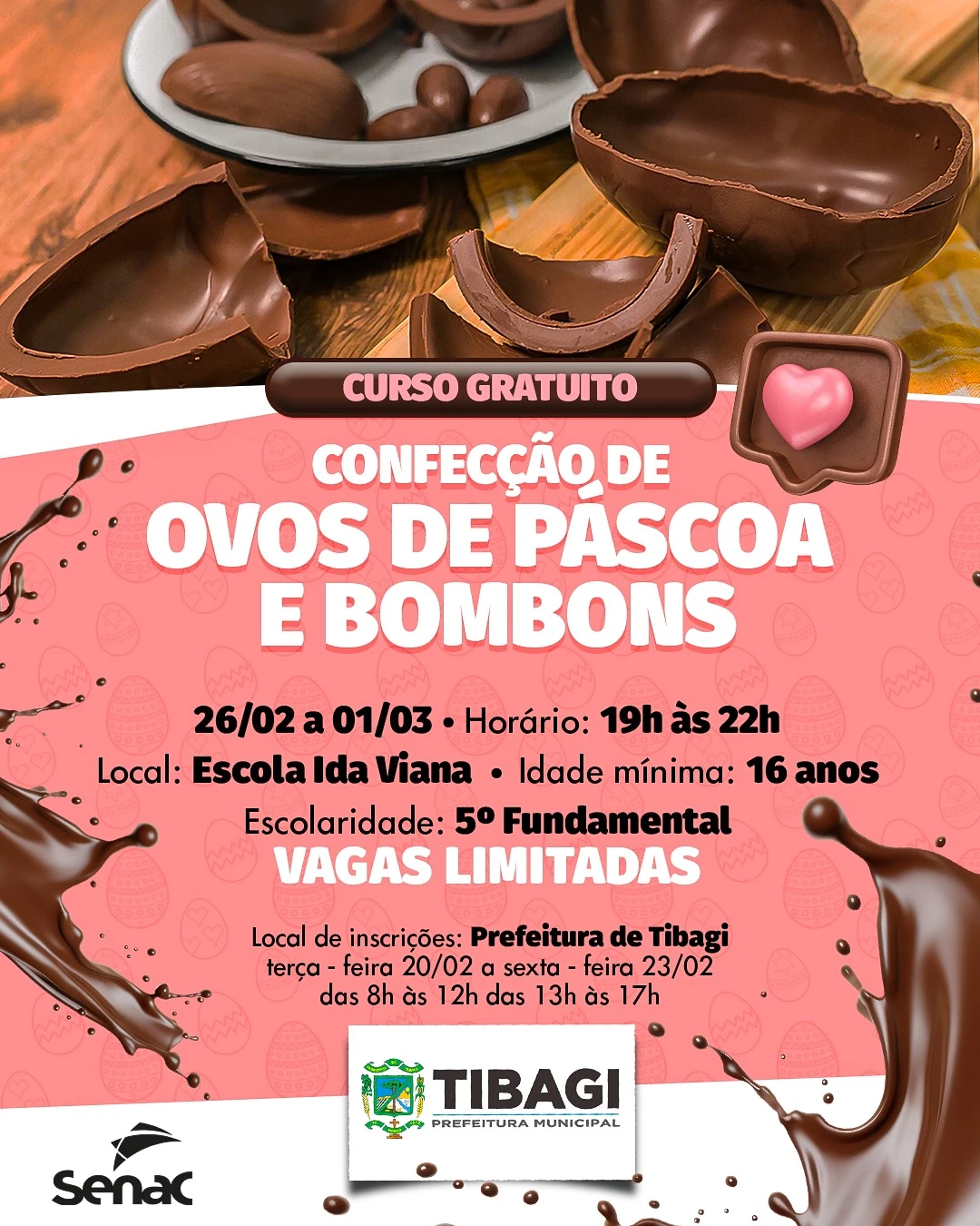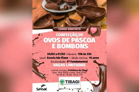 COM ASSESSORIAS - A Prefeitura de Tibagi informa que está aberta a inscrição para o curso gratuito de confecção de ovos de Páscoa e bombons. Os tibagianos interessados devem se inscrever desta terça-feira (20) até a próxima sexta-feira (23) no Palácio do Diamante.