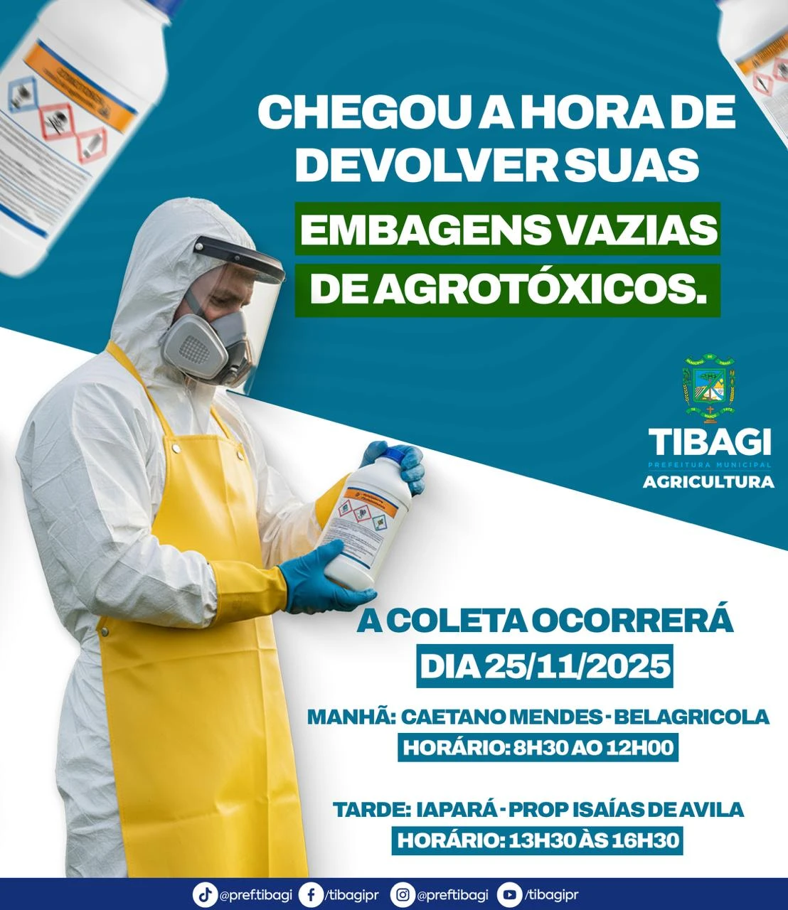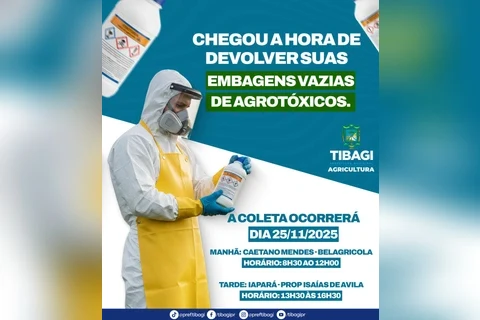 COM ASSESSORIAS - A Prefeitura de Tibagi, por meio da Secretaria Municipal de Agricultura, realiza no dia 25 de novembro a coleta de embalagens vazias de agrotóxicos. A ação busca incentivar o descarte correto dos recipientes e garantir a preservação ambiental e a segurança dos produtores rurais.