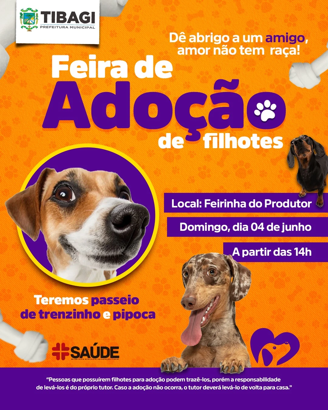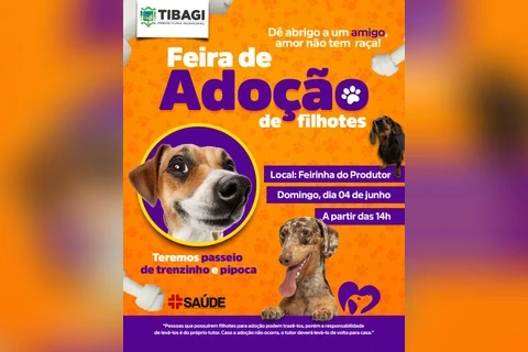 COM ASSESSORIAS - A Prefeitura de Tibagi, através da Secretaria de Saúde, realiza no próximo domingo (04) mais uma edição da Feira de Adoção de pets a partir das 14h. O evento será realizado na Feira do Produtor (atrás da Igreja Matriz).