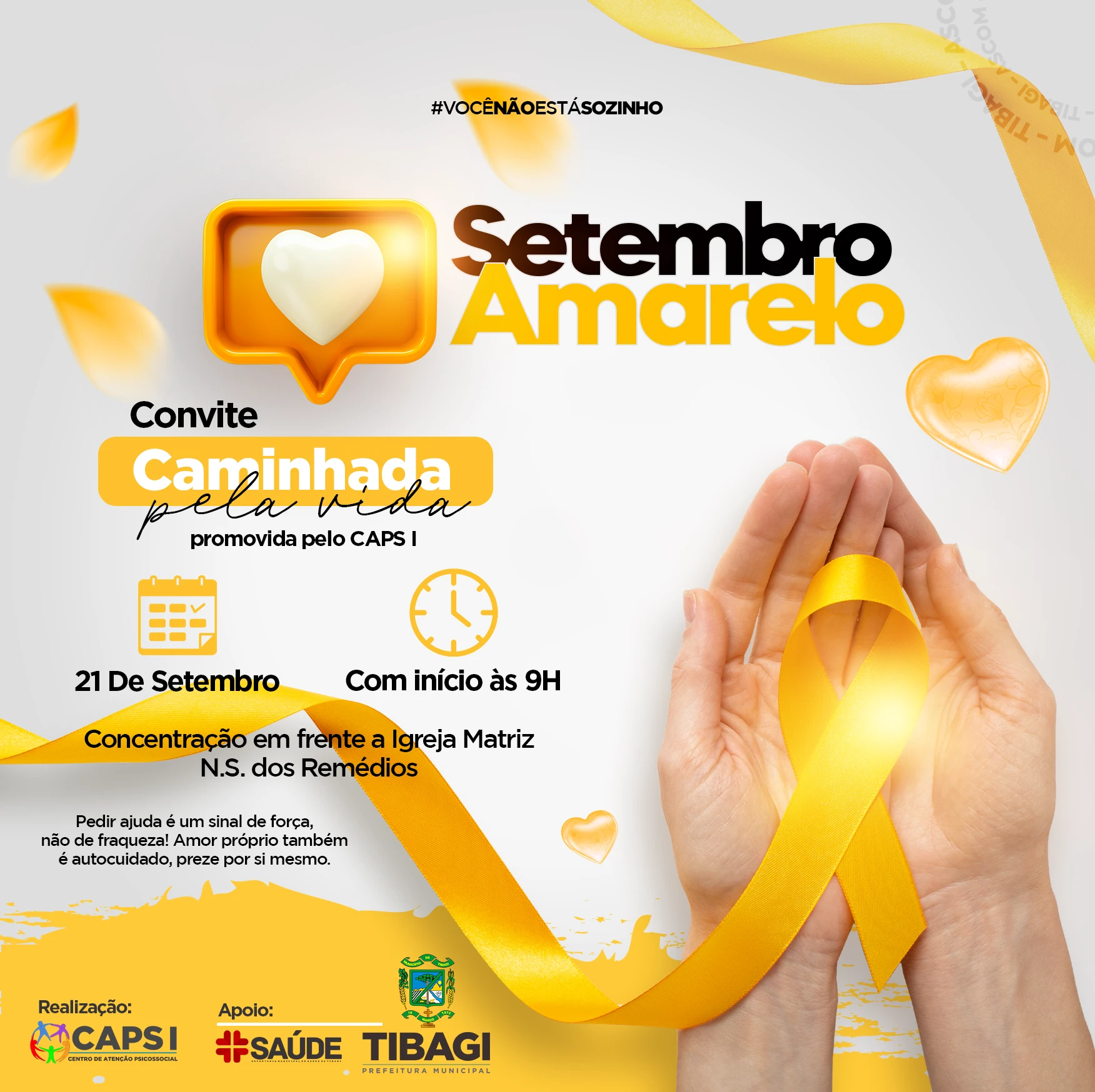 COM ASSESSORIAS - A Prefeitura de Tibagi, através da Secretaria de Saúde e do Centro de Atendimento Psicossocial (CAPS) I, realiza na próxima quinta-feira (21) a Caminhada Pela Vida, evento alusivo ao Setembro Amarelo. A ação tem início a partir das 09h com a concentração em frente à Igreja Matriz N.S. dos Remédio.