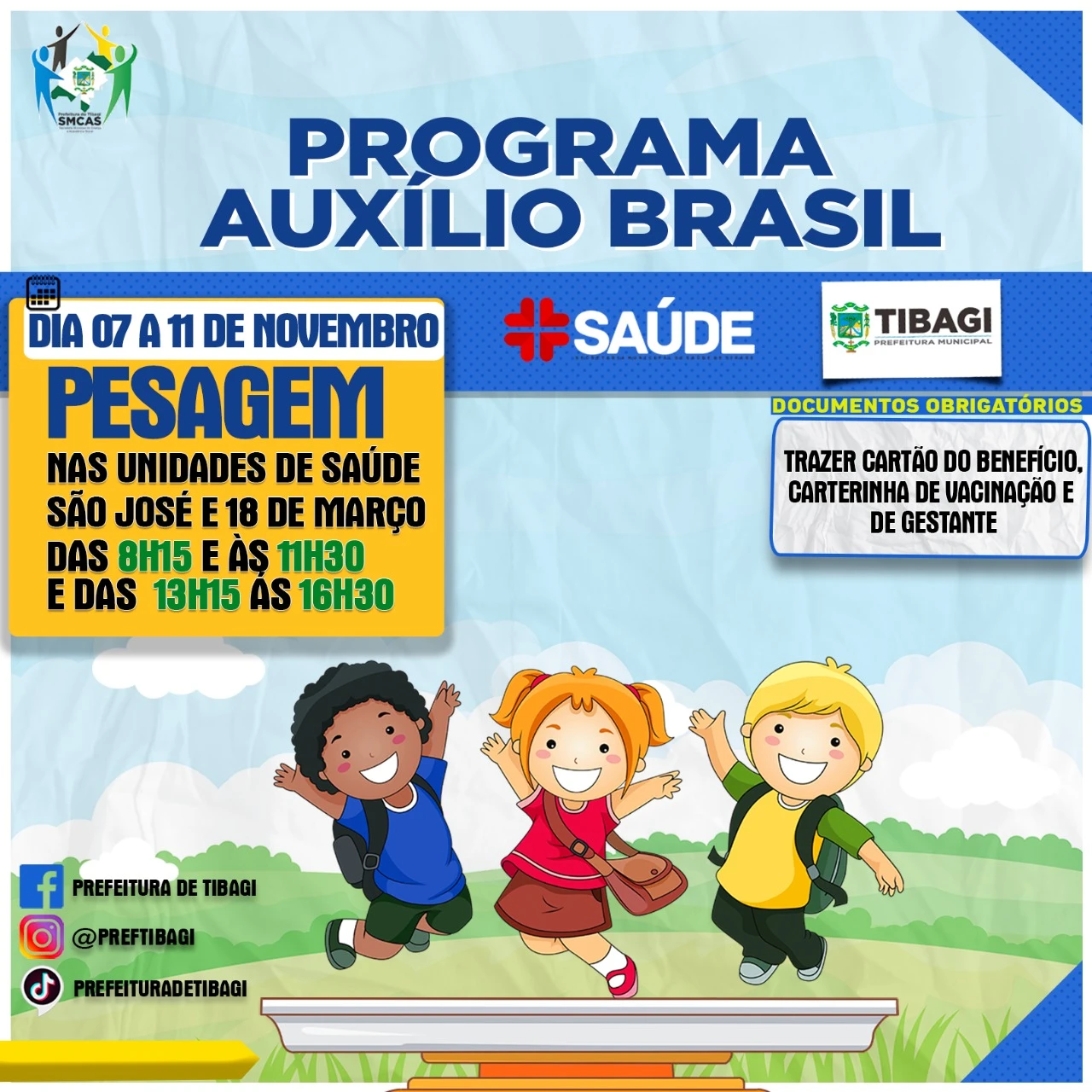 COM ASSESSORIAS - A Prefeitura de Tibagi, através da Secretaria de Saúde, realiza de 07 a 11 de novembro um mutirão para a pesagem obrigatória dos beneficiários do programa Auxílio Brasil, o antigo Bolsa Família.
