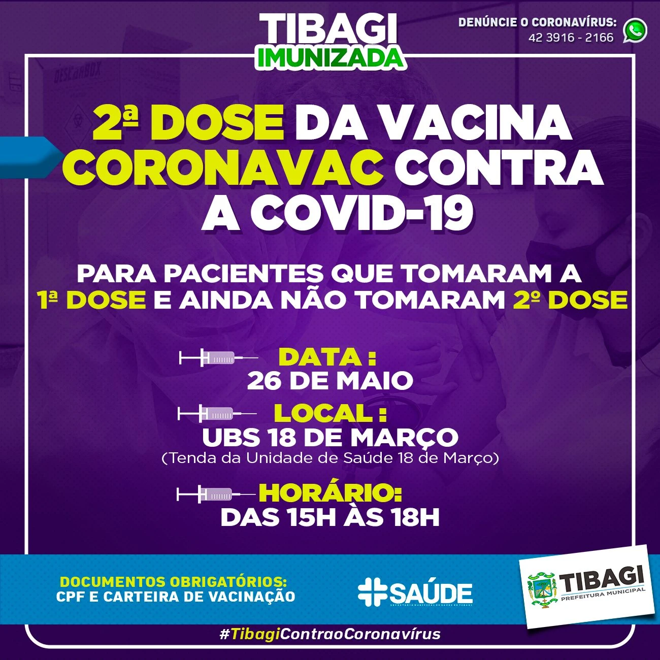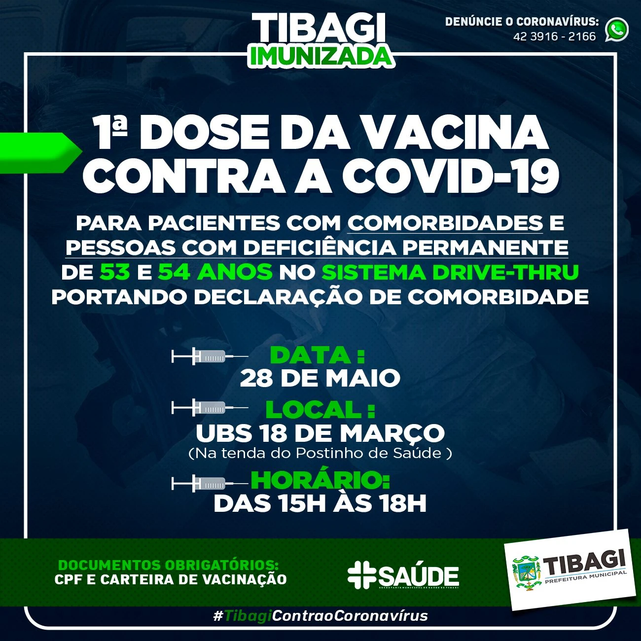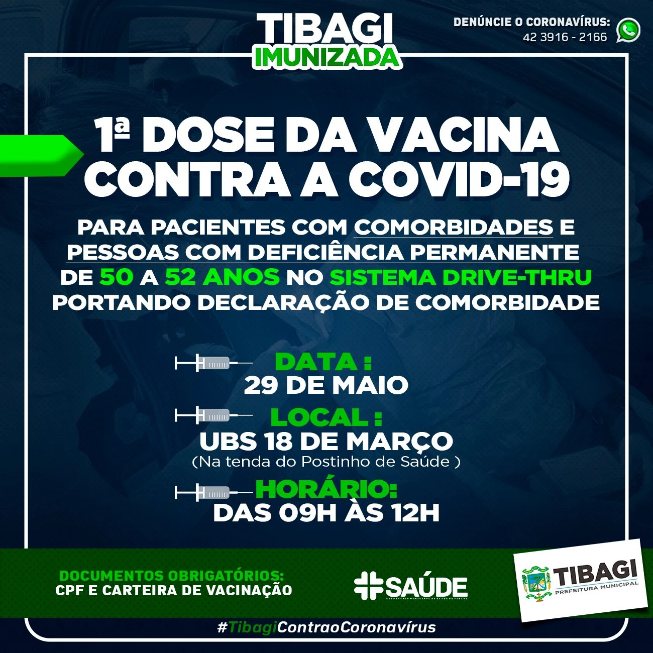 COM ASSESSORIAS - A vacinação contra a Covid-19 em Tibagi não para. A Secretaria de Saúde do município já definiu quais públicos serão vacinados durante a semana. Nos dias úteis a vacinação acontece na modalidade drive thru das 15h às 18h na UBS 18 de março. No sábado a vacina é no período da manhã das 09h às 12h.