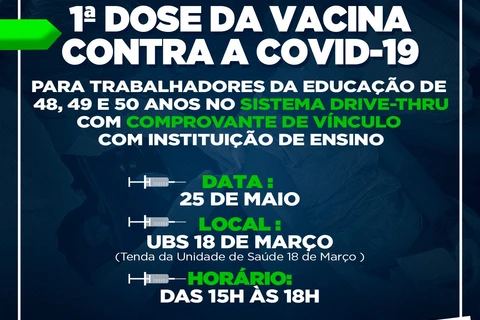 A última semana do mês de maio começa com a vacinação contra a Covid-19 dos profissionais da educação com 49 anos ou mais que acontece nesta terça-feira (25). Professores, Pedagogos, Merendeiras, Zeladoras e demais trabalhadores que atuam dentro das escolas devem levar algum comprovante de vínculo com a instituição de ensino para receber a vacina contra a Covid-19.