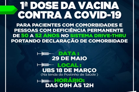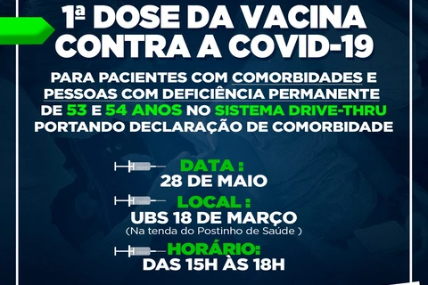Na sexta-feira (28) e no sábado (29) é a vez dos pacientes com comorbidades de 53 e 54 anos e de 50 a 52 anos, respectivamente. Lembrando que todas as pessoas com comorbidades devem levar declaração médica comprovando a doença que possuem. É preciso também levar o CPF e a carteirinha de vacinação.