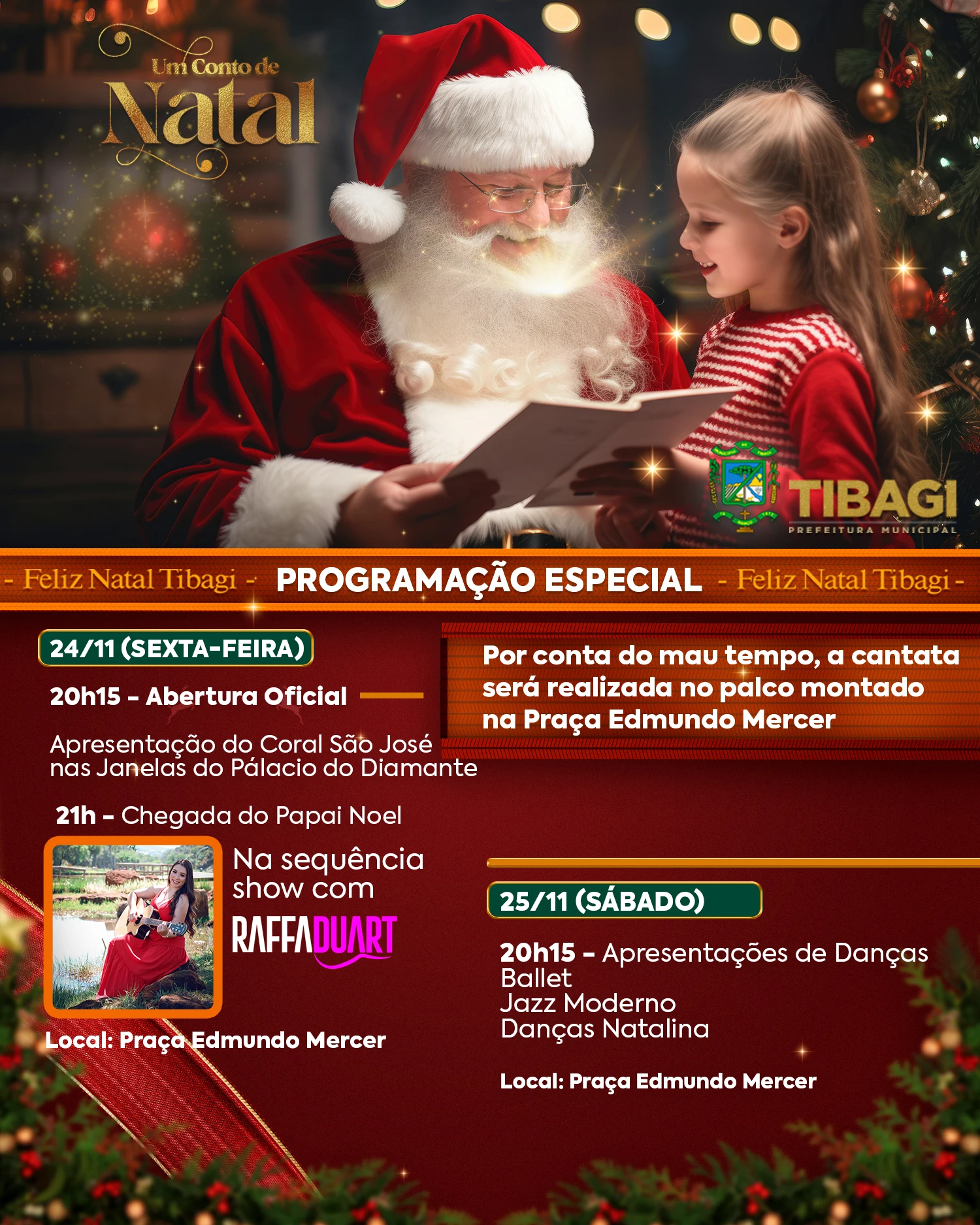 COM ASSESSORIAS - Na noite desta sexta-feira (24) a Prefeitura de Tibagi dá início a programação de natal 2023 a partir das 20h15. Intitulado “Um Conto de Natal”, as apresentações especiais vão até o dia 16 de dezembro, sempre às sextas e sábados.