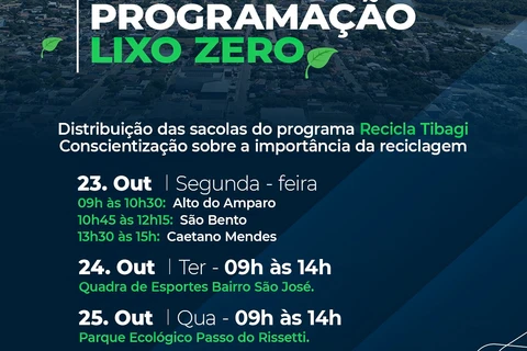 As ações no município começam nesta segunda-feira (23) nos distritos de Alto do Amparo (das 09h às 10h30), São Bento (das 10h45 às 12h15) e Caetano Mendes (das 13h30 às 15h) e vão até o próximo sábado (28). Durante a semana, em vários pontos no município, serão distribuídas as sacolas do programa Recicla Tibagi e também a conscientização sobre a importância da reciclagem.