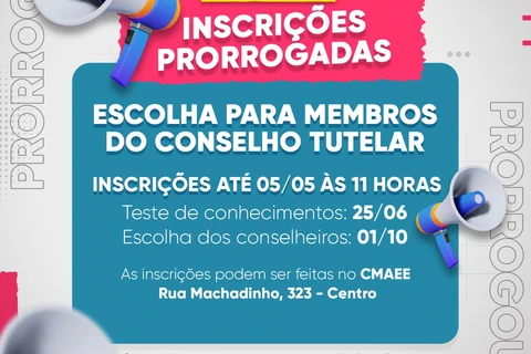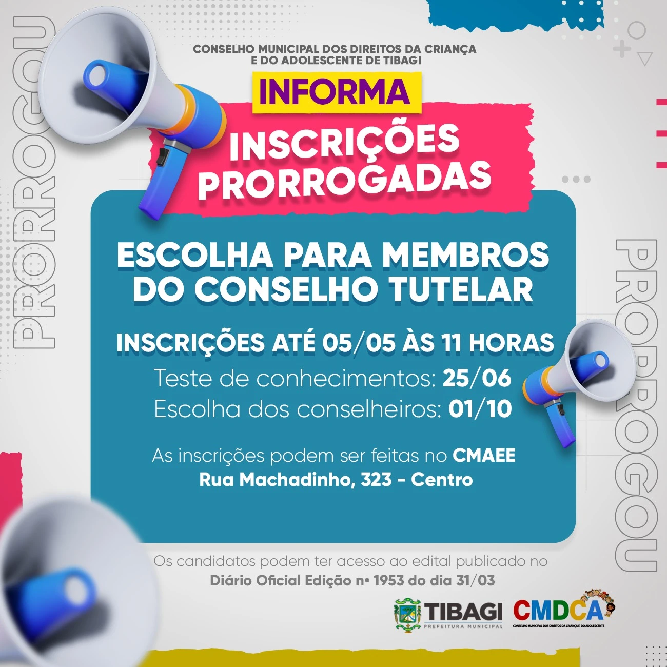 COM ASSESSORIAS - A Prefeitura de Tibagi, através do Conselho Municipal dos Direitos da Criança e do Adolescente (CMDCA), informa que as inscrições do processo seletivo para a escolha dos novos membros do Conselho Tutelar para o quadriênio 2024-2027 foram prorrogadas até o dia 05 de maio (próxima sexta-feira) às 11h.