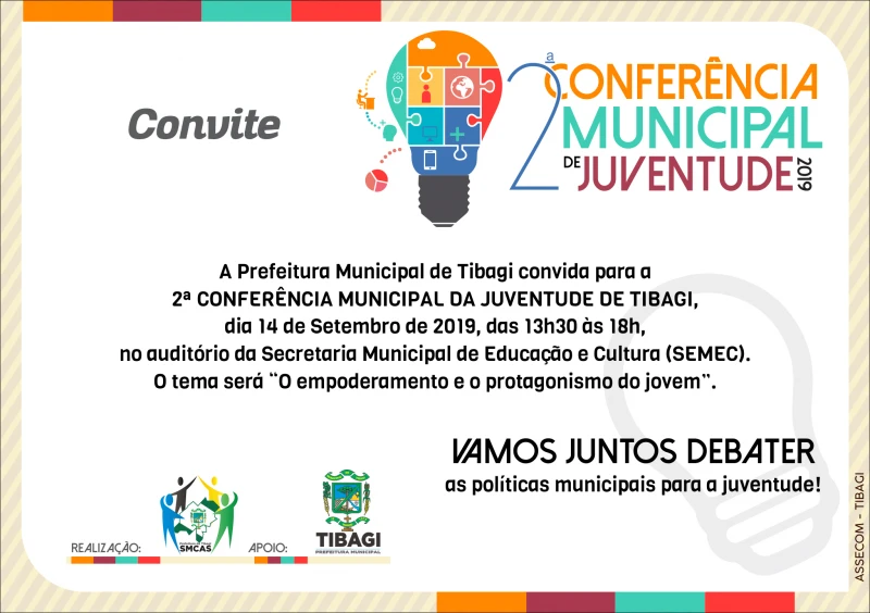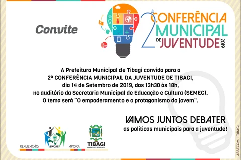 IMPRENSA/Tibagi - Neste sábado (14), a Prefeitura de Tibagi realizará a 2ª Conferência Municipal da Juventude. O tema desta edição será "O Empoderamento e Protagonismo do Jovem". O evento será no Auditório da Secretaria Municipal de Educação e Cultura (Semec), a partir das 13h.