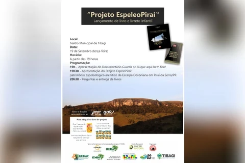 COM ASSESSORIAS - A Prefeitura de Tibagi, através da Secretaria de Turismo, informa que será realizado no município um evento sobre o Projeto EspeloPiraí: patrimônio espeleológico arenítico da Escarpa Devoniana em Piraí da Serra/PR. O evento acontece no dia 19 de setembro (terça-feira) a partir das 19h no Teatro Tia Inália. A entrada é gratuita.