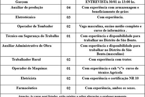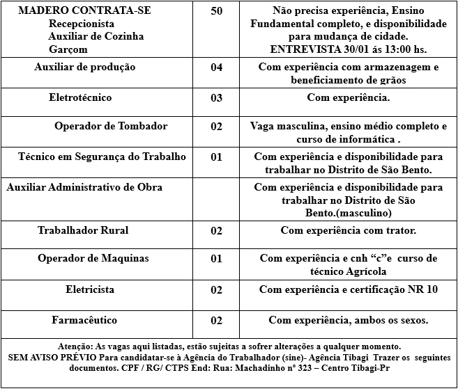 TIBAGI - Vagas de emprego para quinta-feira, dia 23