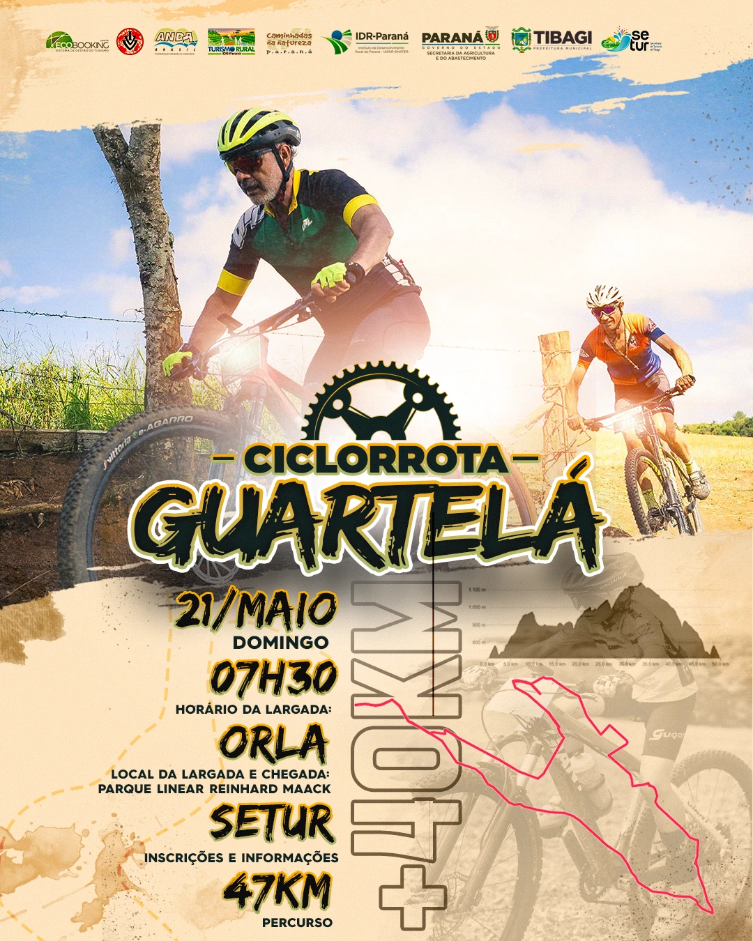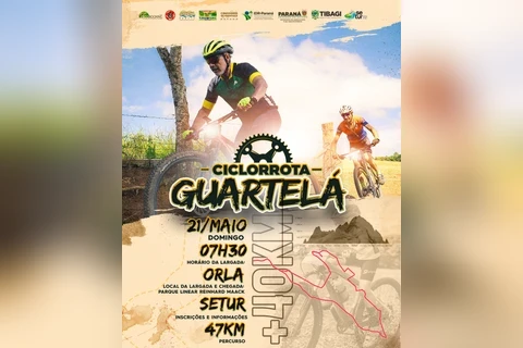 COM ASSESSORIAS - A Prefeitura de Tibagi, através da Secretaria de Turismo, informa que no dia 21 de maio (domingo) acontece no município a primeira Ciclorrota Guartelá, evento de pedalada gratuito para a população tibagiana e de toda a região.