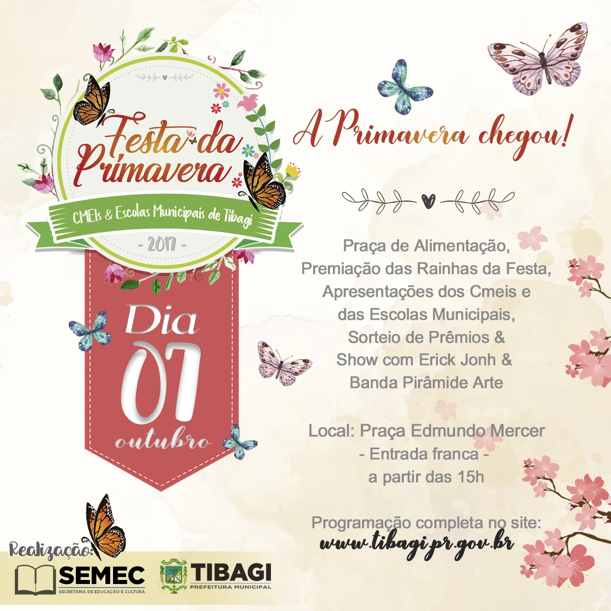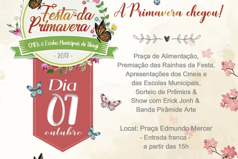 Esta sexta-feira (22) é oficialmente o primeiro dia da Primavera e para comemorar a Prefeitura, através da Secretaria Municipal de Educação e Cultura (SEMEC), anuncia a primeira festa da Primavera das Escolas Municipais e Cmeis de Tibagi. Muita diversão, apresentações das escolas, teatro, brincadeiras, praça de alimentação e show num palco montado especialmente para o evento vão animar a comunidade escolar no próximo dia 7 de outubro. A festa será na Praça Edmundo Mercer, com início previsto para as 15h. Haverá sorteio de prêmios e a participação do grupo de teatro Triolé e show com Erick John e Banda Pirâmide Arte.
